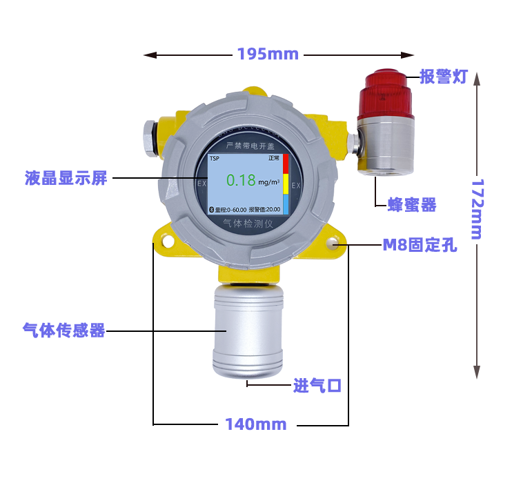 | 报警方式 | 声光报警 LED灯+≥85dB (选配) | 安装方式 | 靠墙面(离气体泄漏源靠近的地方) |
