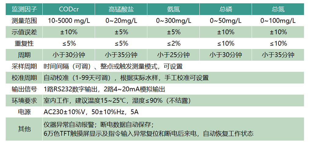 5. 检测单元:根据选配的参数组成,常用的有化学需氧量、氨氮、总磷、水质五参数等。