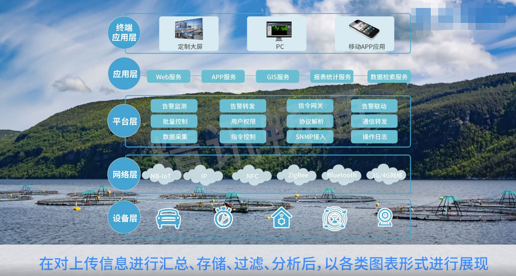 水产养殖环境智能监控系统是 水产养殖节约、高产、高效、 生态、安全的发展需求,基于智能传感、无线传感网、无线通信、 智能处理与智能控制等物联网 技术的开发,集水质环境参数在 线采集、智能组网、无线传输、智能处理、预警信息发布、决策支持、远程自动控制等功能于一体的水产养殖物联网系统。